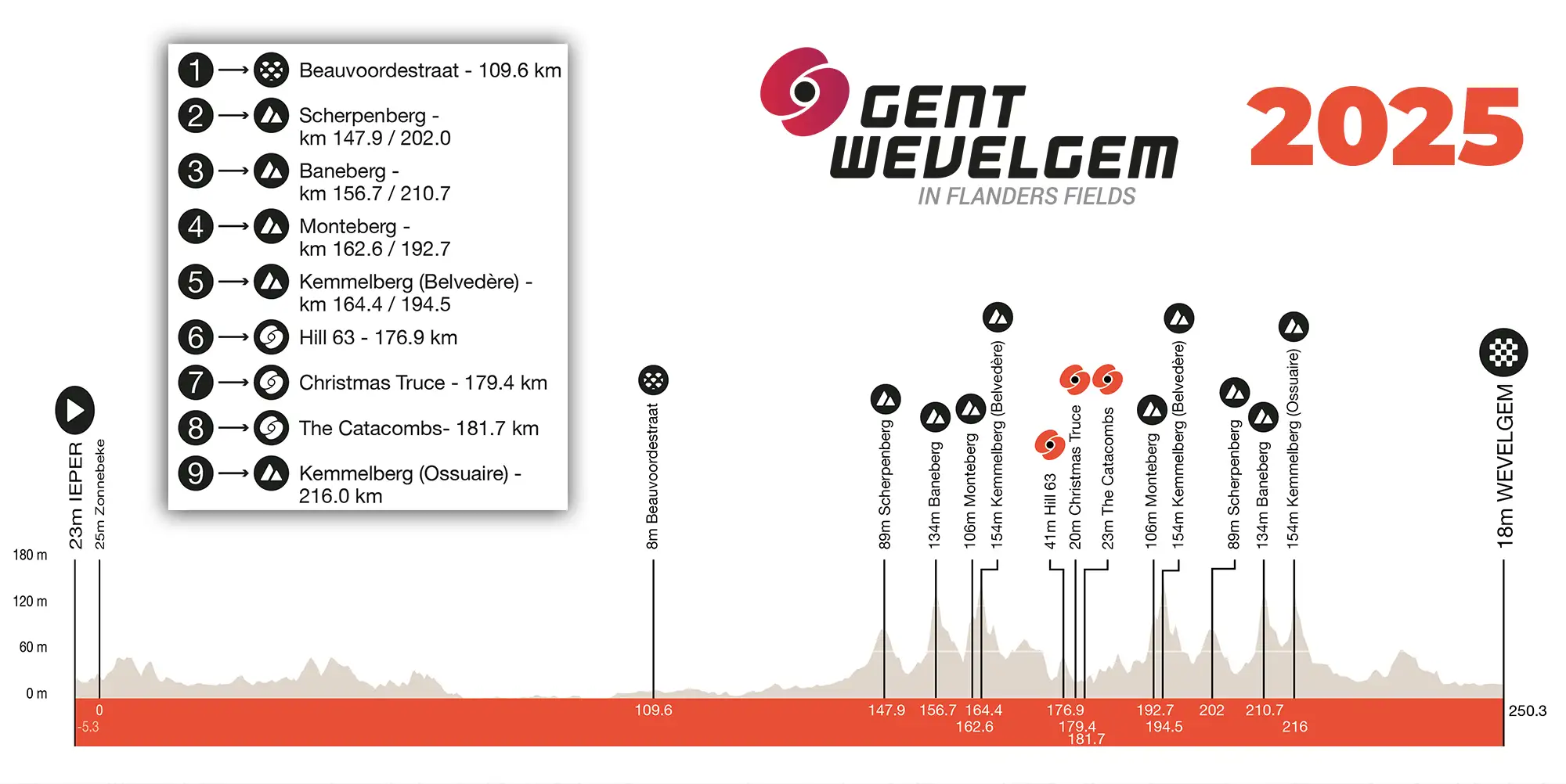 La Gante-Wevelgem cuenta con un recorrido de 250 kilómetros y varios tramos adoquinados de entidad. Aunque a diferencia de otras clásicas flamencas, los últimos 35 kilómetros, prácticamente llanos, dificultan una cabalgada en solitario.
